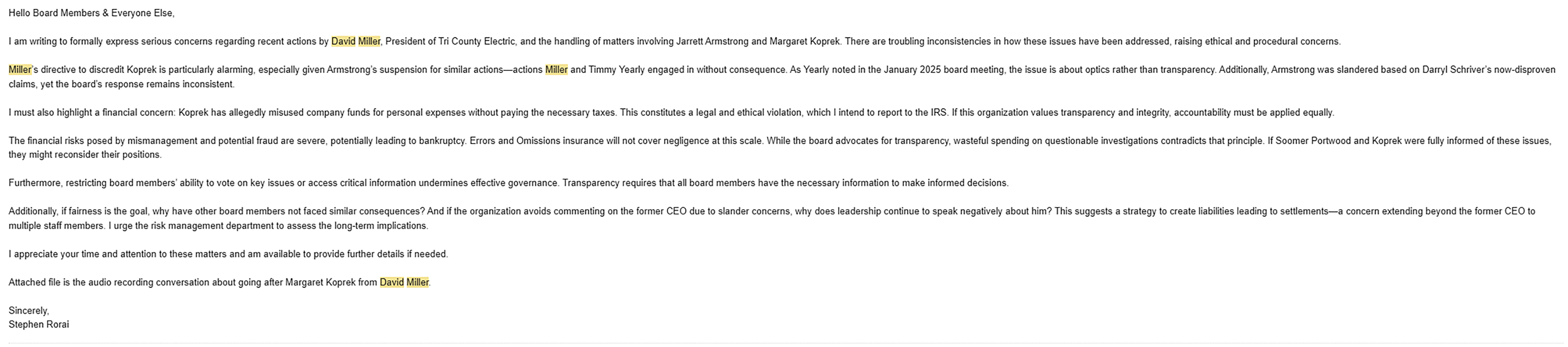 An email was sent, causing David Miller to immediately resign from Tri-County Electric. See, he was recently promoted to the President of the Board and started to pull some BS, so an email was sent out, and he resigned within 12 hours of such email! Who, tho he claims he was just too busy, but he was super proud to take on the president role! Also, as soon as he left because of his claim of lack of time, he took on a new role with the City of Reno. Thought he was out of time, man, can no one keep their lies? Sorry, I mean, story straight?